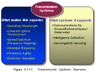 Overview (See Figure 8.11-1) This subsection covers the militarily critical technology for information transmission equipment and components used for transfer of voice, data, record, and other information by electromagnetic means either through atmospheric, exoatmospheric, or subsurface (water) media or via metallic or fiber optic cable. Information being exchanged is predominantly in digital form for voice, text, graphics, video and databases. This facilitates the application of security as required. The majority of the technologies for telecommunication transmission equipment are common to both military and civil systems. The information may be analog or digital, ranging in bandwidth from a single voice channel to video or multiple channels occupying hundreds of megahertz. Technologies identified as militarily critical include those for laser communications through atmospheric, exoatmospheric, and subsurface media or over optical fiber; radio transmission equipment operating at frequencies > 30 GHz with spread spectrum for low probability of intercept communications; phased array antennas for beam forming or nulling of interfering signals; and high-capacity, digitally controlled radio receivers. Other technologies considered were cable transmission technology for cables used where reduced vulnerability to intercept is of concern and underwater communications for concentrated naval operations. The types of cables considered are single or multiconductor, twisted pair or coaxial metallic cable, and those using optical fiber conductors. Cables can be employed on the surface for rapid deployment or buried in the earth for protection or as means of providing a required degree of hardness. Other applications are underwater inter-island or intercontinental connections. Technologies identified are those for single mode fibers with low dispersion; halide-based fibers of extremely low loss; and components and accessories for fiber.