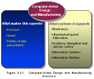 Overview (See Figure 8.2-1) Computer-aided design (CAD) is a technology enabling the design of intricate and often complex devices, mechanisms, and/or systems. The finished designs have detailed design data that permit a quality release for parts modeling and manufacturing. Computer-aided manufacturing (CAM) is a companion technology that supports the fabrication of a wide variety of devices and mechanisms with favorable impact on scheduling, flexibility, quality, and costs. The principal users of CAD and CAM systems have integrated the essentials of both CAD and CAM into a single, central data base that contains complete repositories of pertinent design and manufacturing data from which their entire engineering and manufacturing operations are driven. The ability to build and test computer models of proposed designs without having to construct expensive and time-consuming hardware is extremely beneficial to industry. Currently evolving is a functional hierarchical extension, based on CAD/CAM, that progresses through Virtual Prototyping, Data Visualization, Visually Coupled Systems, and Virtual Reality Systems, elements that underpin sophisticated computer modeling and simulation.