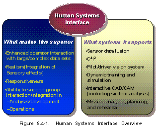 Overview (See Figure 8.4-1) Human systems interface, as covered in this subsection, encompasses all ways in which human operators interact with information systems. While the primary interfaces at present are visual output and manual input, the broader technology area also includes other forms of sensory inputs including auditory (voice and other audible indicators and warning), tactile, and haptic devices for both input and output. Human interface technology is being driven by a variety of requirements, ranging from those of the entertainment industry to the need to grasp and manipulate extremely large data sets in scientific research. For two-way communication, the state of the art remains mechanical (keyboard, joystick, etc.), which provides an input that is inherently unambiguous. Hands-off input devices (including eye-tracking, voice input) are being pursued as a way of dealing with increased workload, without increasing operator stress. Ultimately, the goal is to achieve total immersion of the operator in a virtual reality with which he or she interacts in a manner that is perceived as normal.
