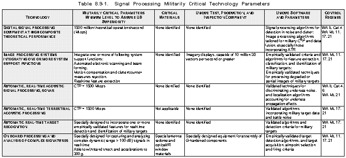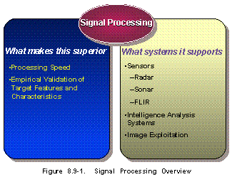 Rationale (See Table 8.9-1) Signal processing is a basic enabling technology for all telecommunications and military sensors. The ability to control and exploit the electromagnetic spectrum has become an increasingly vital element of the electronic battlefield. Signal processing is, in effect, the first layer of quality assurance for information that will ultimately be used for decision-making in the battlefield. The accuracy and reliability of that data, particularly in environments with high levels of interference (both unintentional and countermeasures induced), is critical to mission success.
