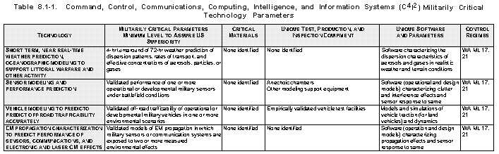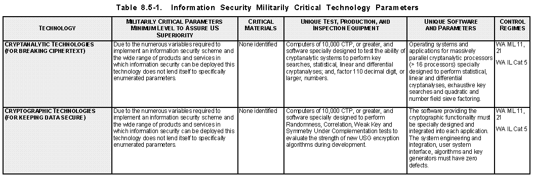 Rationale (See Table 8.5-1) The cryptographic and cryptanalytic technologies are essential to provide information security for US military weapons systems and research and development activities and to support essential USG cryptographic and cryptanalytic functions. Information security systems, equipment, subassemblies, and components are essential elements of intelligence, global surveillance, computer and communications networks, and C4I2 systems that provide reliable wide band communications links and information management nodes through the chain of command and channels of communications from the National Command Authorities (NCA) to the warfighters.