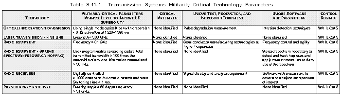 Rationale (See Table 8.11-1) The technologies for developing and producing a variety of types of telecommunications equipment used for electromagnetic transmission of information over any media provide for information exchange to control forces without impeding their mobility. The technology used minimizes the probability of information intercept by any third party. It nullifies the effect of electronic warfare assets that may be employed by a third party to counter the accurate receipt by the intended recipient of the information transmitted.