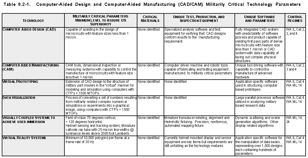 Rationale (See Table 8.2-1) As the complexity and capability of weapon systems mount, the operating characteristics of a given design and its producibility must be well-defined and understood before an expensive build-up program is fully launched. Extensive computer modeling and simulation has become essential for a wide variety of major military components, such as ships, submarines, aircraft, surface vehicles, and missiles, and the subsystems incorporated within them. Because of increased operating cost and decreasing availability of assets, computer-based simulators are now used to obtain data that would previously have been acquired through live operational tests and exercises. Computer-based simulators, employing elaborate 2D and 3D graphic techniques, enable designers to exercise an otherwise unattainable range and variety of tactical situations. Virtual Prototyping and Data Visualization are extensions of CAD/CAM and are being used in the modeling and simulation of a variety of designs requiring high-performance computers and supercomputers for execution.