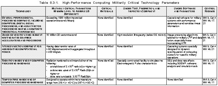 Rationale (See Table 8.3-1) High-performance computing is an enabling technology for modern tactical and strategic warfare. It is the principal technological force multiplier that gives US forces their superior ability to detect, localize, and effectively engage enemy forces in a high threat/target-rich environment. It is also an enabling technology for processing the massive amounts of imagery and sensor data for real-time data fusion and generating synthetic environments for dynamic training and simulation, mission planning and rehearsal, and operational battle management. Embedded computers are key enabling elements for improved sensors and smart weapons; for navigation, guidance, and control of military platforms; and for all aspects of operational C4I2. Advanced computing is also important in the development of WMD and represents an enabling technology for deployment and use of WMD, particularly for CBW delivery, where the problem of predicting precise patterns of dispersion is computationally demanding. Access to unique software revealing operational limitations or vulnerabilities of US systems or to threat information and intelligence sources and methods might be exploited to defeat or degrade US mission performance. The ability of recipients to cluster computers on low-cost (~ $3500 per dual port) switching hubs is a growing factor in setting practical effective lower limits for proliferation reasons. Such hubs, using a variety of technologies and protocols, are increasingly being used to network small enterprises to allow more effective aggregation of processing power.