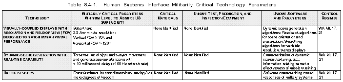 Rationale (See Table 8.4-1) Significant advances in human system interfaces are required for circuit and projected military operations in the high-threat, information-rich battlefield of the future. In combat operations, two-way human interfaces facilitate an operator's ability to handle large quantities of information in real time to improve situational awareness and decision-making capability in periods of high stress. In weapons systems, they will also improve reaction time and control in tactical vehicles, particularly in attack helicopters and combat aircraft. While the notion of unmanned drones for reconnaissance and targeting has been largely accepted by operational forces, higher fidelity, robust human interfaces will be a key enabling technology for deployment and use of unmanned engagement systems. Human system interfaces are also key to the kind of virtual prototyping of systems and production processes essential to maintaining industrial-base preparedness and responsiveness.