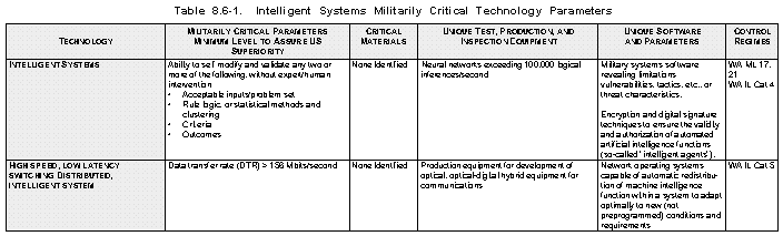 Rationale (See Table 8.6-1) The range and lethality of weapons available to potential adversaries have increased dramatically. Intelligent systems, in the form of smart sensors and autonomous vehicles and weapons, have the potential of increasing mission effectiveness while reducing exposure of human operators. As pilot's assistants, this technology can also reduce manpower and training requirements, again while maintaining or improving effectiveness. These same features will also enhance our ability to analyze military operations in realistic scenarios and conditions for system development, development of tactics and doctrine, and mission planning and rehearsal. Finally, intelligent systems are needed as part of battle management and C4I2 systems to sustain US forces' superior ability to detect, localize, and effectively engage enemy forces in a high-threat/ target-rich environment.