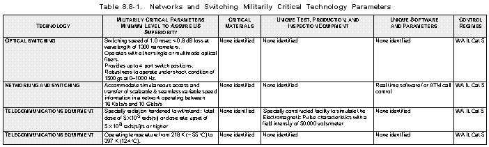 Overview (See Figure 8.8-1) This subsection covers the militarily critical technology for telecommunication equipment used for the electronic transfer of information. It encompasses technologies for "stored-program-controlled" circuit and packet switching equipment and network routers used for establishing a communication channel between two or more points. Switches may be categorized as circuit, message, and packet or any combination thereof. The technologies found in information networking and network control are heavily dependent on the automation of the monitoring and controlling functions within the network. The monitoring and controlling functions are combined in separate systems, which are capable of working over a widely dispersed geographical area with equipment using various transmission media and switches using common channel signaling. These systems provide a centralized control capability to configure transmission equipment to optimize networks for loading and failures and to configure switches and routers to optimize the call distribution within a network. Technologies identified are optical switching, radiation hardened telecommunications equipment, and equipment capable of operating in extremely cold and hot temperatures. Related technologies are multi-level priority and pre-emption; dynamic adaptive routing; optical switching; and asynchronous transfer mode (ATM).