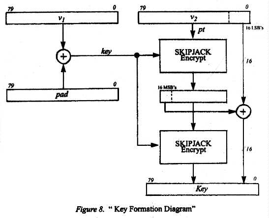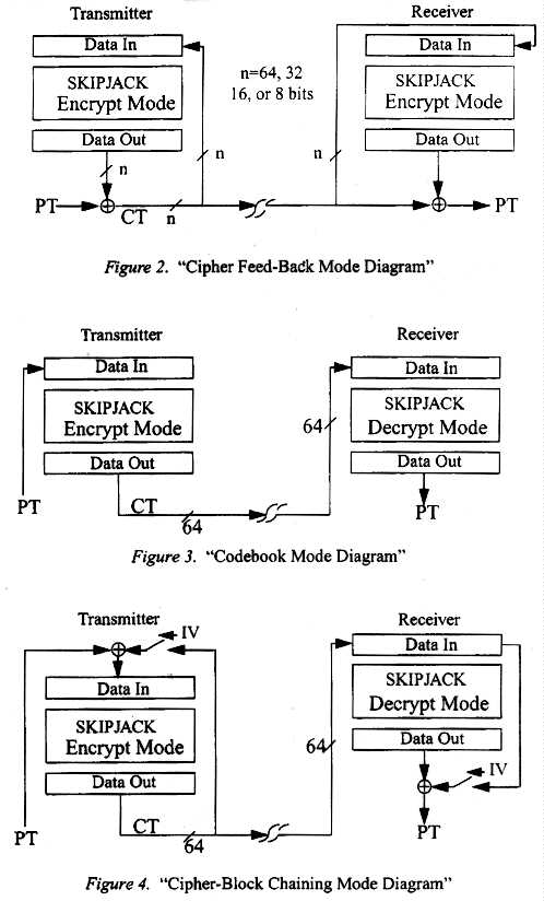A. SKIPJACK Modes of OperationSKIPJACK is a 64 bit codebook utilizing an 80-bit cryptovariable. the modes of operation are a subset of the FIPS-81 description of modes of operation for DES [1]. These include: