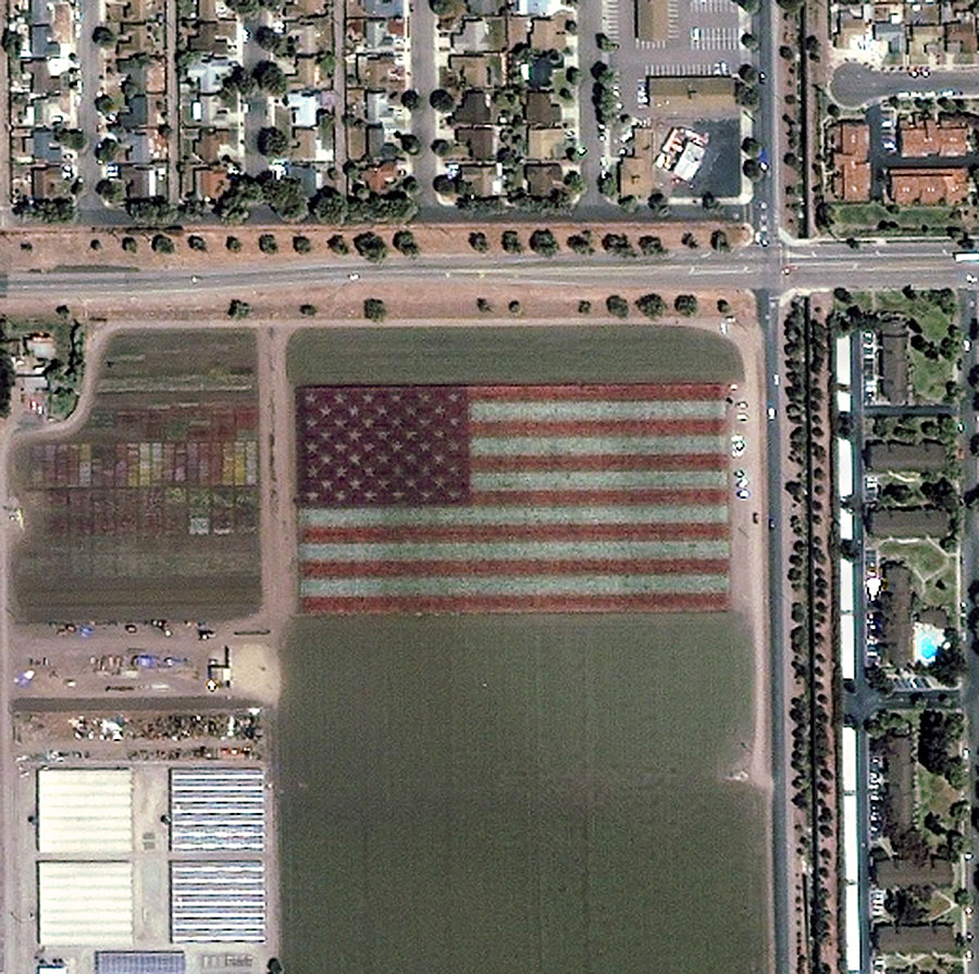 Below: IKONOS satellite 30 June 2002. "The 6.5-acre flag measures 740 by 390 feet. More than 400,000 Larkspurs were planted in January which have now bloomed into more than two million red, white and blue flowers. " spaceimaging.com |