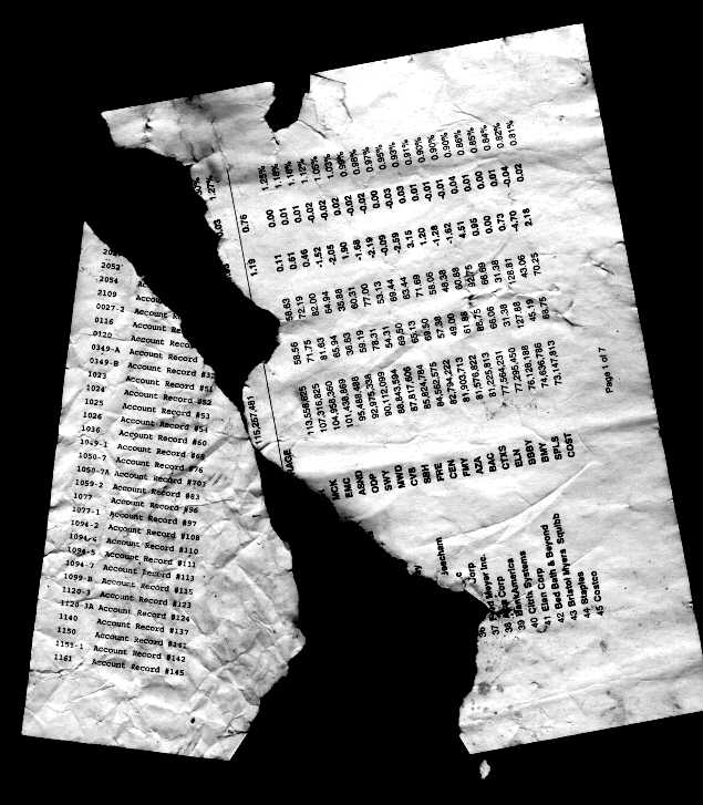 Charred documents retrieved from residential backyard in Carroll Gardens, Brooklyn, New York following World Trade Center collapse, 11 September, 2001. |